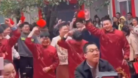 新郎接親伴郎熱舞亮相 發(fā)小手持音響領(lǐng)舞排面拉滿